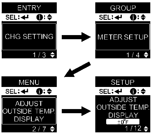 3. While in the customizing mode, select the "CHG SETTING", and enter the "METER SETUP." Then select the "ADJUST OUTSIDE TEMP. DISPLAY", and calibrate the value with the SEL/RESET switch and the INFORMATION (ꭡ / ꭢ) switch.