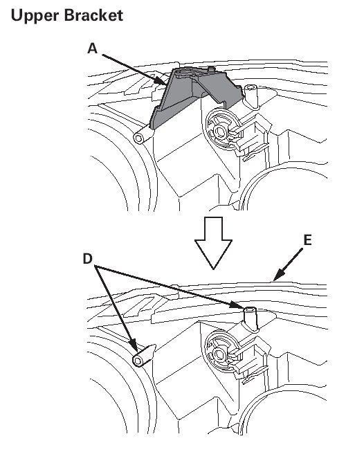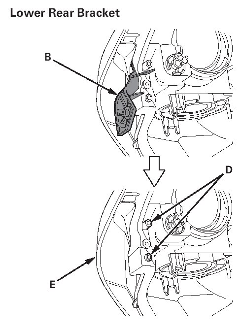 When the upper bracket (A), the lower rear bracket (B), or the lower front bracket (C) of the headlight assembly (D) are broken, it can be reinstalled using the repair brackets if it meets this criteria;