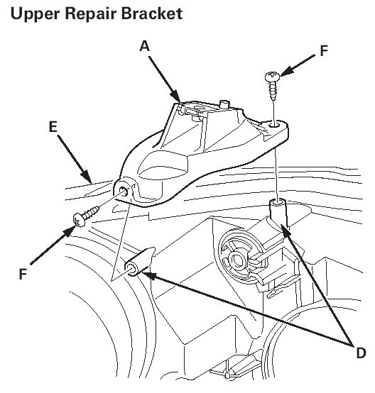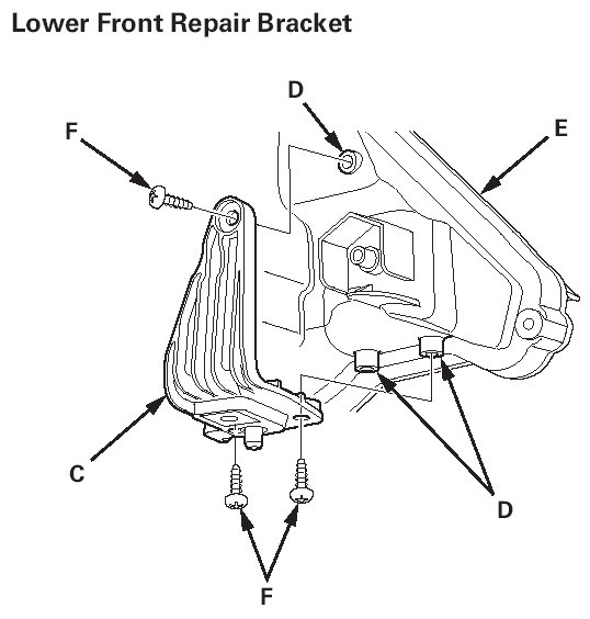 4. Install the upper repair bracket (A), the lower rear repair bracket (B), or the lower front repair bracket (C) on the bosses (D) of the headlight housing (E), then fasten it with the screws (F) provided with the repair bracket.