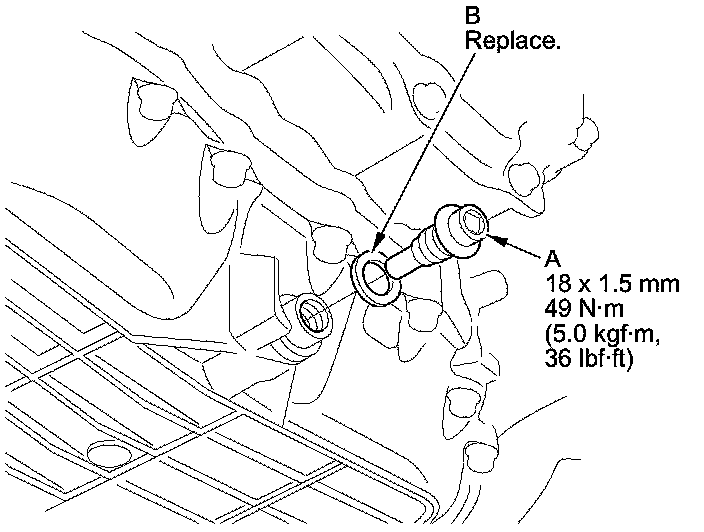 3. Reinstall the drain plug and a new sealing washer (B).