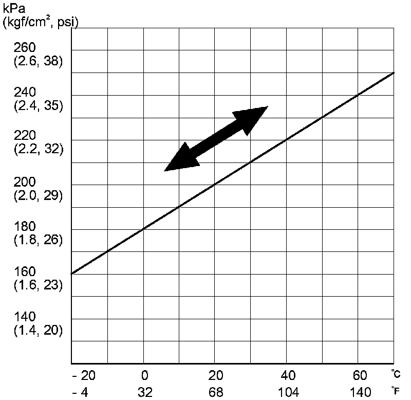 Tire pressures increase slightly as the temperature in the tires rises during driving. Pressures can also increase or decrease slightly with changes in outside air temperature. A temperature change of about 18 °F(10 °C) changes tire pressure by about 10 kPa (0.1 kgf/cm2, 1.5 psi). If the temperature drops, tire pressure could decrease enough to turn on the low tire pressure indicator, but later, the tire temperature could increase enough to turn the indicator off. To resolve a complaint of such intermittent indications, confirm and clear the stored DTC(s) and check the tire pressures. Then explain to the customer how temperature changes can affect the system.