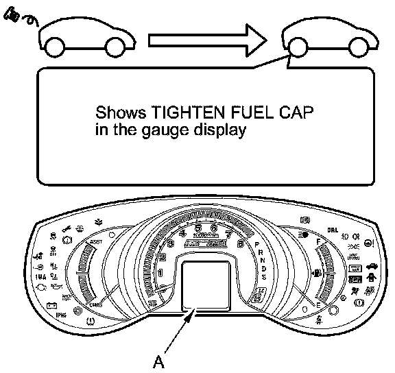 The first time a leak is detected, a TIGHTEN FUEL CAP message appears in the gauge display (A). To scroll to another message, press the select/reset button. The TIGHTEN FUEL CAP message appears each time you restart the engine until the system turns the message off.