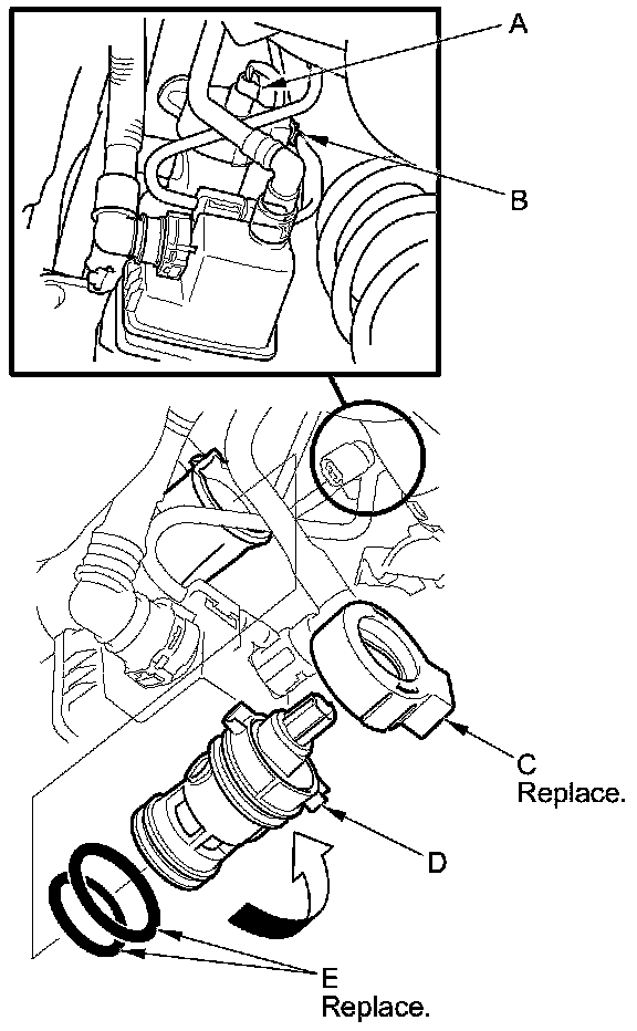 7. Install the parts in the reverse order of removal with new O-rings (E) and a new cap.
