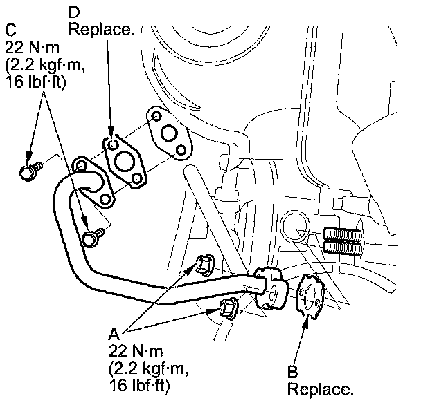2. Install the EGR pipe to the TWC side, tighten the bolts (C) by hand with a new gasket (D), then torque the bolts.