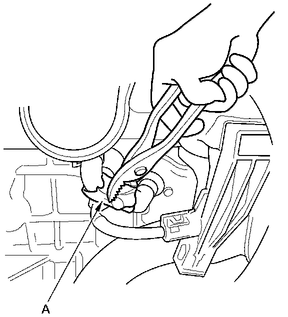 2. At idle, make sure there is a clicking sound from the PCV valve when the hose between the PCV valve and intake manifold is lightly pinched (A) with your fingers or pliers.