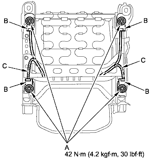 4. Remove the TORX nuts (A) attaching the seat track (B) to the weight sensors (C) using a TORX E18 socket, then remove the slide lever (D).