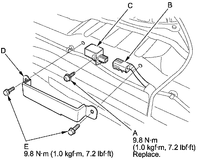 2. Install the rear safing sensor cover (D) with two bolts (E).