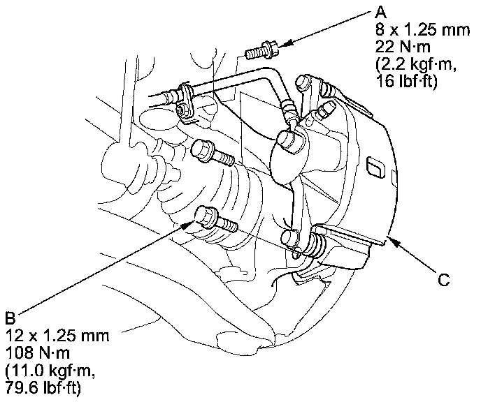 4. Remove the brake caliper bracket mounting bolts (B), then remove the caliper assembly (C) from the knuckle. To prevent damage to the caliper assembly or the brake hose, use a short piece of wire to hang the caliper assembly from the undercarriage. Do not twist the brake hose excessively.