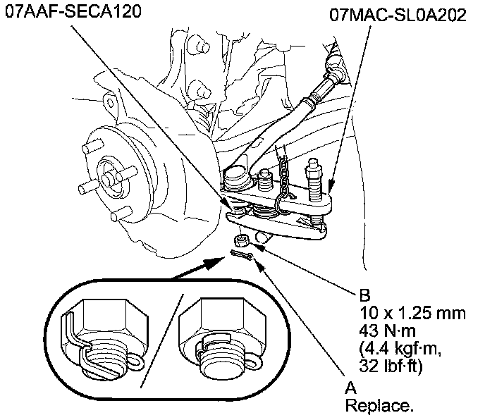 - First install all the components, and lightly tighten the bolts and the nuts, then raise the suspension to load it with the vehicle's weight before fully tightening to the specified torque. Do not place the jack against the ball joint of the lower arm.