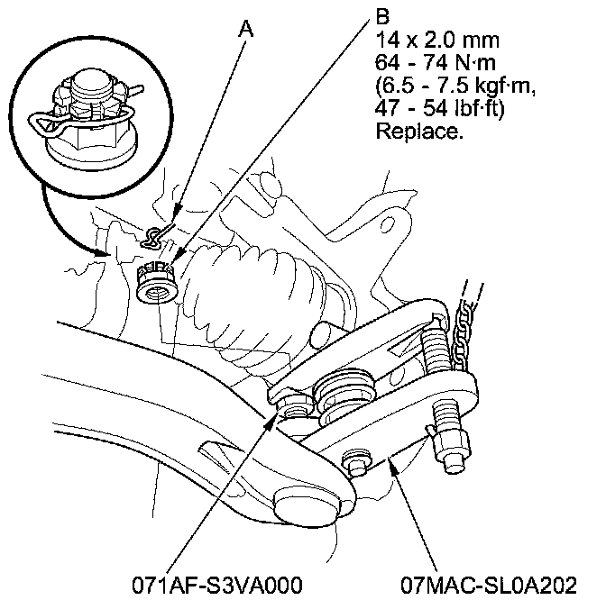 11. Remove the lock pin (A) from the lower arm ball joint, then remove the castle nut (B).