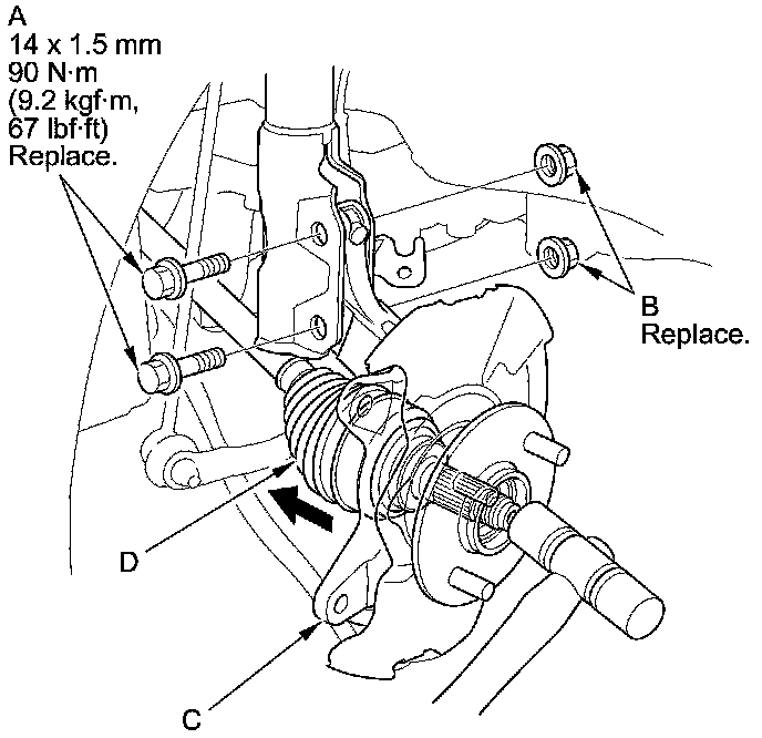 14. Pull the knuckle (C) outward, and separate the outboard joint (D) from the front hub using a plastic hammer.