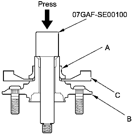 9. Install the hub (A) onto the knuckle (B) using the attachment, the driver handle, the support base, and a hydraulic press. Be careful not to damage the splash guard (C).