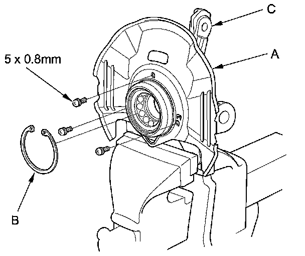 3. Remove the splash guard (A) and the snap ring (B) from the knuckle (C).