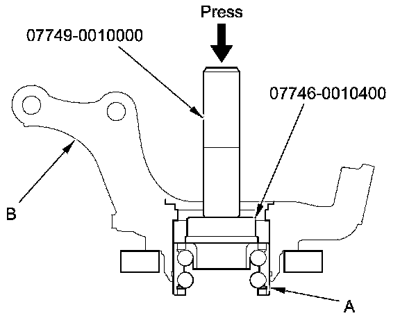 4. Press the wheel bearing (A) out of the knuckle (B) using the attachment, the driver handle, and a press.