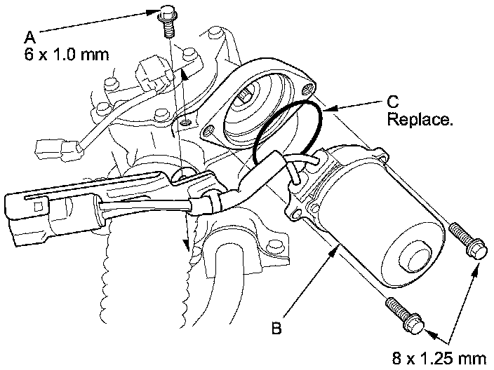 3. Remove the connector bracket mount bolt (A), then remove the EPS motor (B) and the O-ring (C).