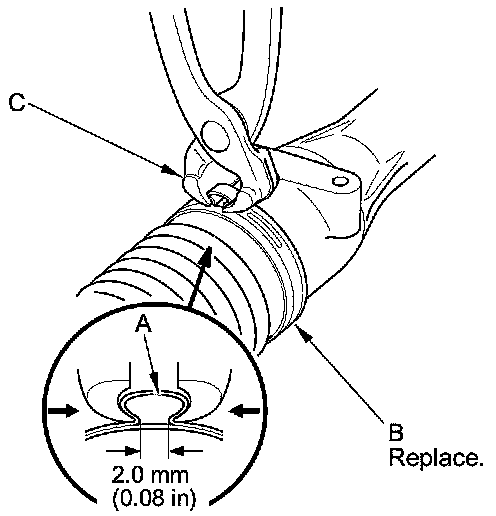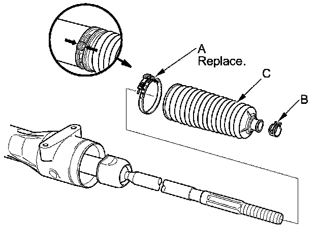 4. Remove the boot bands (A), and discard them. Remove the tie-rod clips (B), and pull the boots (C) away from the ends of the steering gearbox.