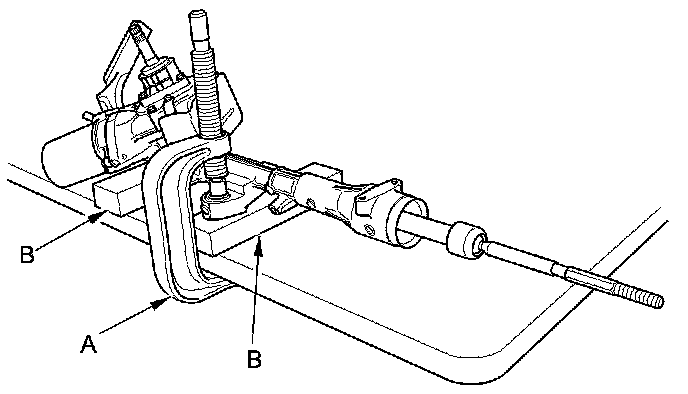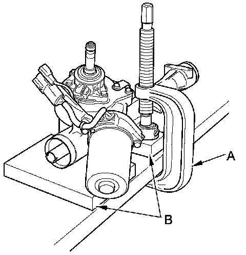 1. Hold the gearbox housing using a C-clamp (A) and wooden blocks (B) to a workbench as shown. Do not clamp the cylinder part of the gearbox housing in the vise.