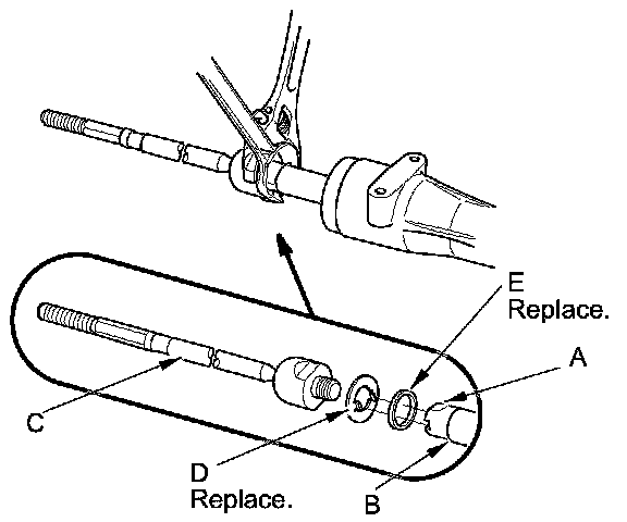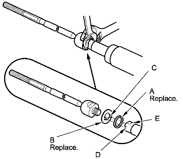 2. Install a new rubber stop (A) and a new lock washer (B). Align the lock washer tabs (C) with the slots (D) on the rack end (E) while holding the lock washer in place. Repeat this step for the other side of the rack shaft.