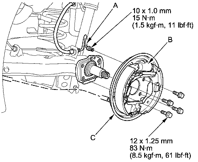 8. Remove the backing plate (C) with the brake shoes assembly from the spindle.