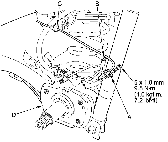 9. Remove the wheel speed sensor (A), the wheel speed sensor clip (B), and the wire guide grommet (C) from the axle beam (D). Do not disconnect the wheel speed sensor connector.