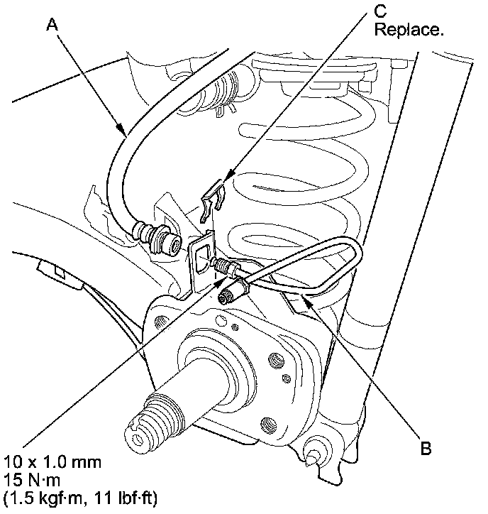 11. Disconnect the brake hose (A) from both sides of the brake line (B), then remove the brake line by removing the brake hose clip (C).