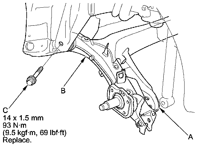 13. Remove the axle beam mounting bolt (C) on both sides.