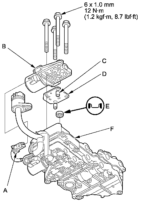 4. Install the CVT clutch pressure control solenoid valve (four bolts) with the two dowel pins and the separator plate on the lower valve body (F).