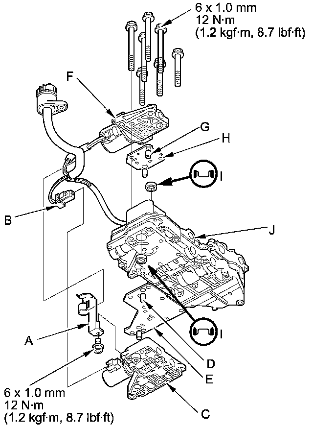 6. Install a new CVT drive pulley pressure control solenoid valve with the dowel pins, the separator plate, the CVT clutch pressure control solenoid valve with the dowel pins, and the separator plate on the lower valve body (J).
