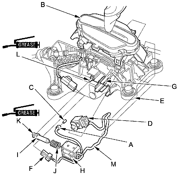 7. Install the shift lock solenoid by aligning the joint (K) of the shift lock solenoid plunger with the tip of the shift lock stop (L), then push the shift lock solenoid into the shift lever bracket base securely.