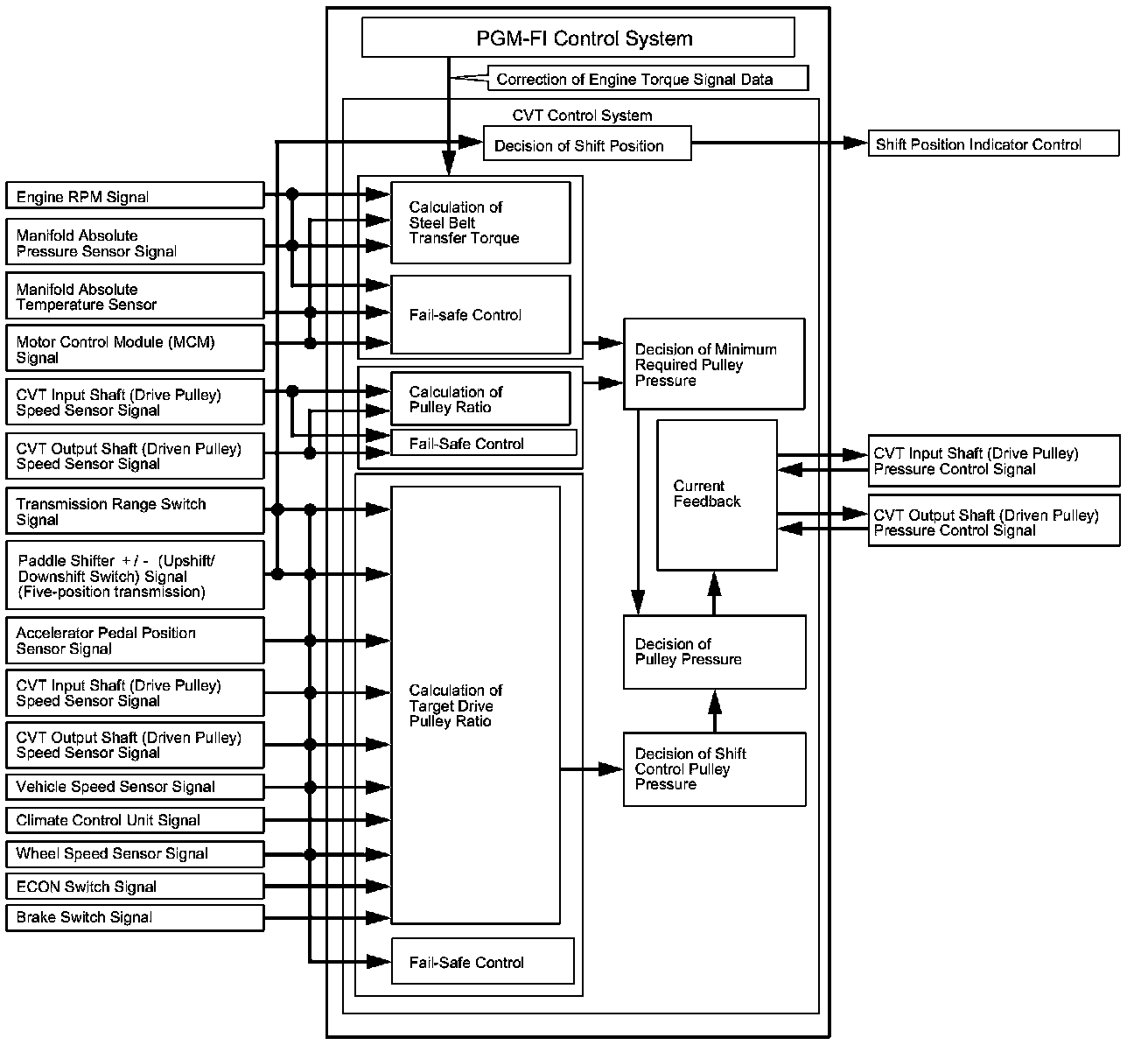 The PCM receives input signals from sensors, switches, other control units, processes data, and outputs signals for the engine control system and the CVT control system. The CVT control system includes shift control, pulley pressure control, start clutch pressure control, and reverse inhibitor control. The PCM actuates the pulley control solenoid valves to control pulley control valves A and B shifting transmission pulley ratios.