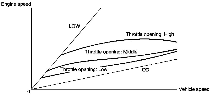 This mode has automatic upshifting areas to prevent engine over-revving, and downshifting areas so the vehicle can run smoothly with more power to cope with upcoming acceleration. When coasting, the transmission downshifts to the next lower stage if the vehicle slows down to the programmed speed, or by pressing the brake pedal.