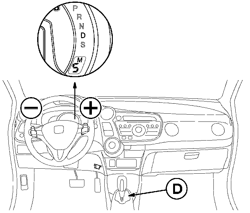 To engage the D-paddle shift mode, press back on either of the steering wheel mounted paddle shifters while driving in the D position. In this mode, the transmission can downshift by pressing the (-) paddle shifter (downshift switch), or upshift by pressing the (+) paddle shifter (upshift switch). There are seven speeds, so each time the transmission is shifted using the paddles, the shift indicator in the gauge control module displays the current position. The display turns off when the transmission upshifts or downshifts automatically.