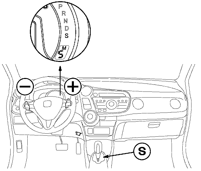 The S position has two shifting modes; the sport driving mode and the S-paddle shift mode. In sport driving mode, the transmission automatically adjusts to keep the engine at a higher rpm than the D-position setting, and the steering wheel-mounted paddle shifters are ready to be activated to switch to the S-paddle shift mode. In the sport driving mode, the shift indicator and the M indicator in the gauge control module do not come on.