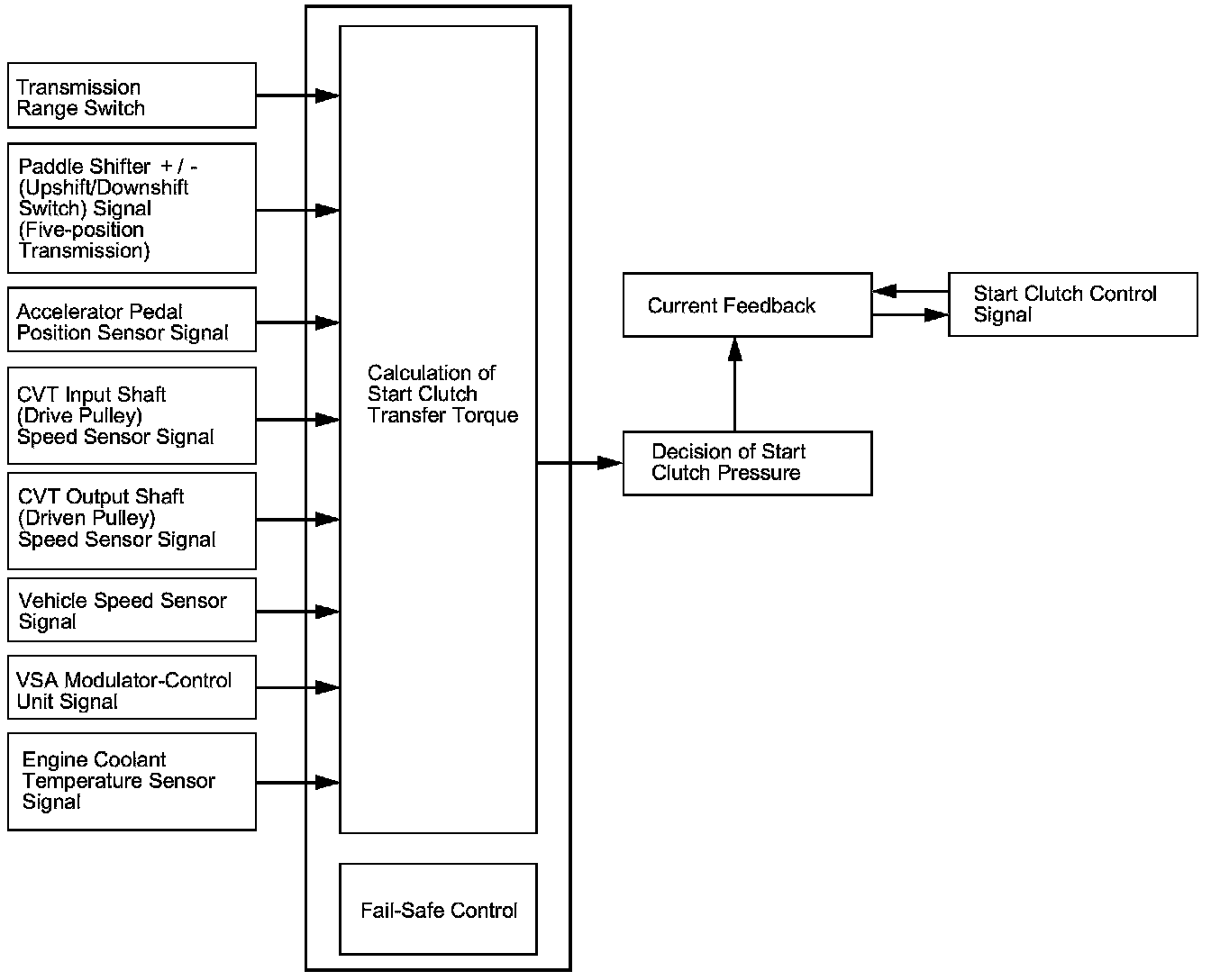 The hydraulic-controlled start clutch, like a torque converter, controls smooth starting-off and creeping in D, S, L, and R. The PCM inputs signals from the sensors and the switches, and actuates the CVT clutch pressure control solenoid valve to regulate the clutch reducing pressure, and the clutch reducing pressure controls the start clutch.