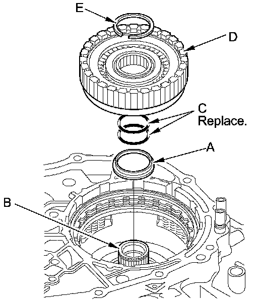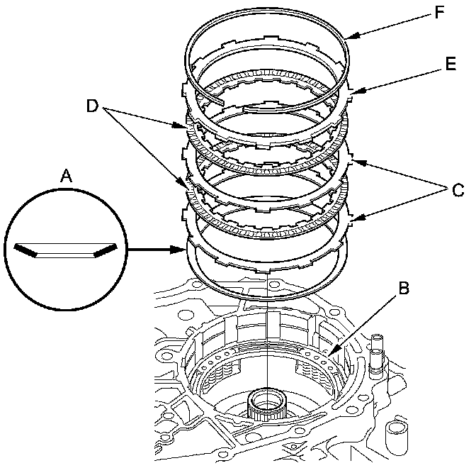 12. Starting with the two reverse brake plates (C), alternately install the two plates and discs (D). Install the reverse brake end-plate (E), then install the snap ring (F).