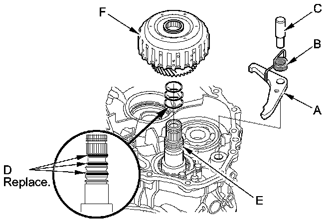 49. Install the thrust washer (A), the thrust needle bearing (B), the thrust washer (C), the CVTF pump drive sprocket hub (D), and the 22 x 28 mm thrust shim (E) on the input shaft (F), and install the snap ring (G) to secure them.