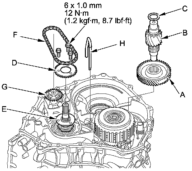 57. Position the CVTF pump drive sprocket (D) on the CVTF pump drive sprocket hub (E), and put the CVTF pump drive chain (F) on the CVTF pump drive sprocket and the CVTF pump driven sprocket (G), then secure the CVTF pump drive sprocket with the three bolts.