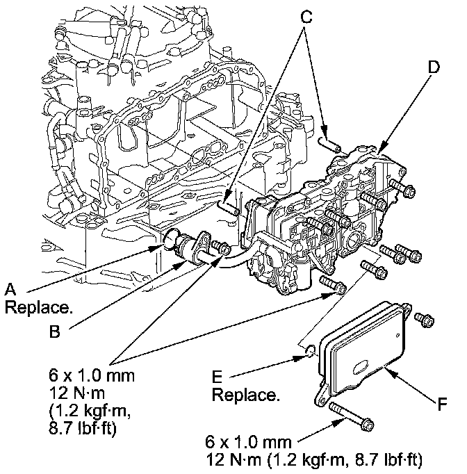 29. Install two new O-rings (D) on the 10.9 x 56 mm CVTF feed pipe (E), then install it with the filter end and an 8 mm CVTF pipe (F) in the intermediate housing.