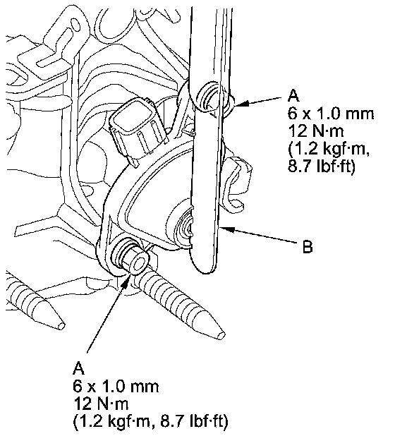 73. Tighten the bolts (A) on the transmission range switch while you continue to hold it in the N position. Do not move the transmission range switch when tightening the bolts. Remove the feeler gauge (B).