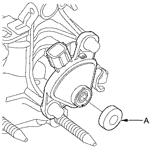 7. Install the reverse brake spring compressor through the drive pulley shaft to compress the spring retainer/return spring assembly (A). Be sure the reverse brake spring compressor is set over the spring retainer, not over the reverse brake piston.