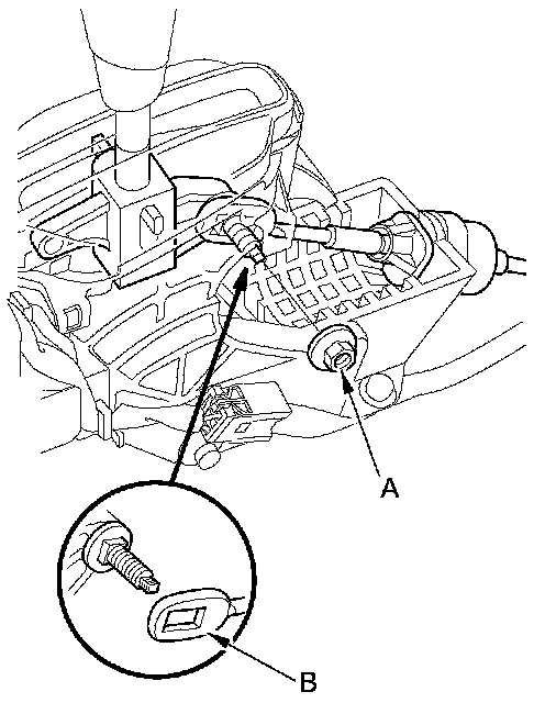 3. Remove the nut (A) securing the shift cable end (B).