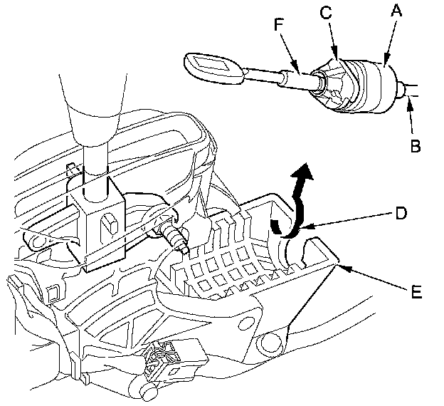 4. Rotate the socket holder (A) on the shift cable (B) a quarter turn; the corner (C) on the socket holder will be in the opening (D) of the shift lever bracket base (E). Then slide the socket holder to remove the shift cable from the bracket. Do not remove the shift cable by pulling the shift cable guide (F).