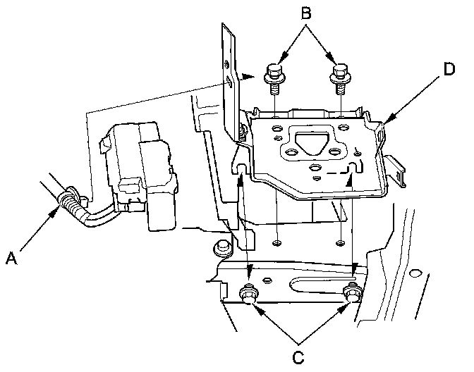 14. Install the transmission mount bracket (A), and loosely install the new transmission mount bracket mounting bolts (B) and nuts (C).