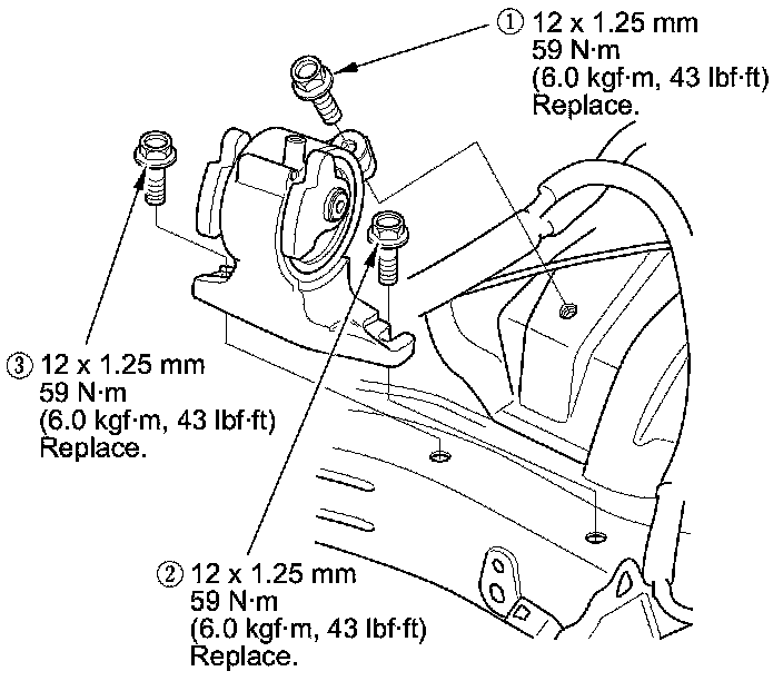 13. Install the transmission mount, and loosely install the new transmission mount mounting bolts, then tighten the transmission mount mounting bolts in the numbered sequence shown.