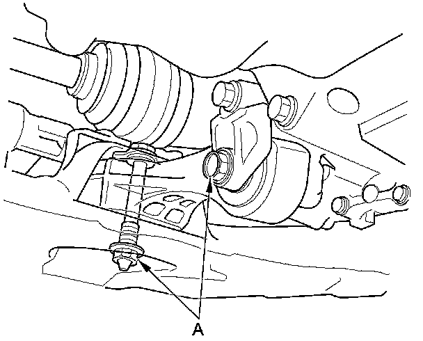 18. Loosen the torque rod mounting bolt and nut (A).