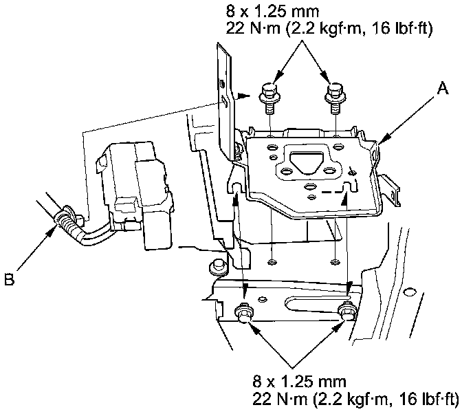 23. Install the battery base (A), then install the harness clamp (B).