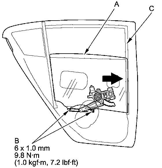 4. Push the glass against the glass run channel (C), then tighten the glass mounting bolts.