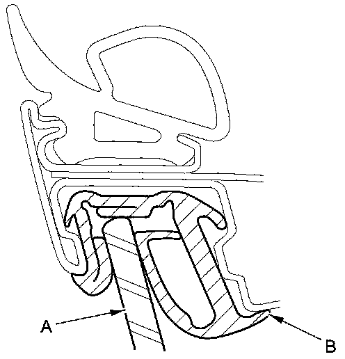6. Raise the glass fully, and check for gaps. Also make sure that the glass (A) contacts the glass run channel (B) evenly.