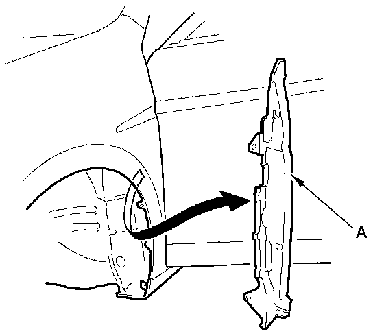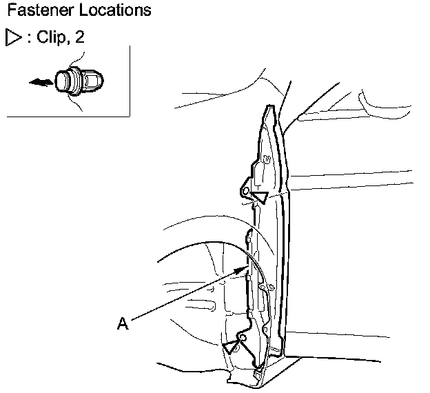 2. From the wheel arch, release the clips fastening the front fender fairing (A).