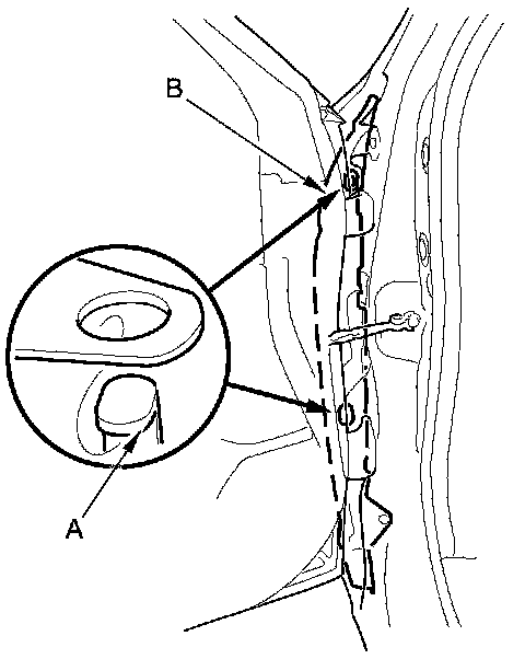 3. Open the front door. Release the hooks (A) fastening the front fender fairing (B).